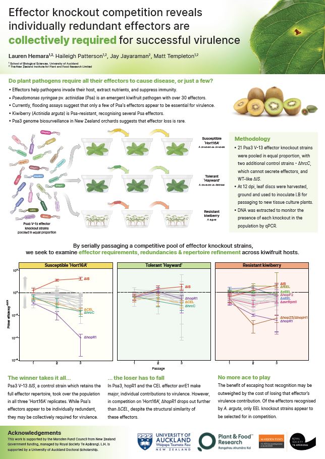 Effector knockout competition reveals individually redundant effectors are collectively required for successful virulence Last updated on Oct 12, 2023 Go to Project Site Poster Lauren Hemara Doctoral Candidate Lauren Hemara is a Doctoral Candidate at the University of Auckland.