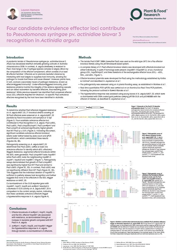 Four candidate avirulence effectors contribute to Psa3 recognition in Actinidia arguta Last updated on Oct 12, 2023 Go to Project Site Poster Lauren Hemara Doctoral Candidate Lauren Hemara is a Doctoral Candidate at the University of Auckland.